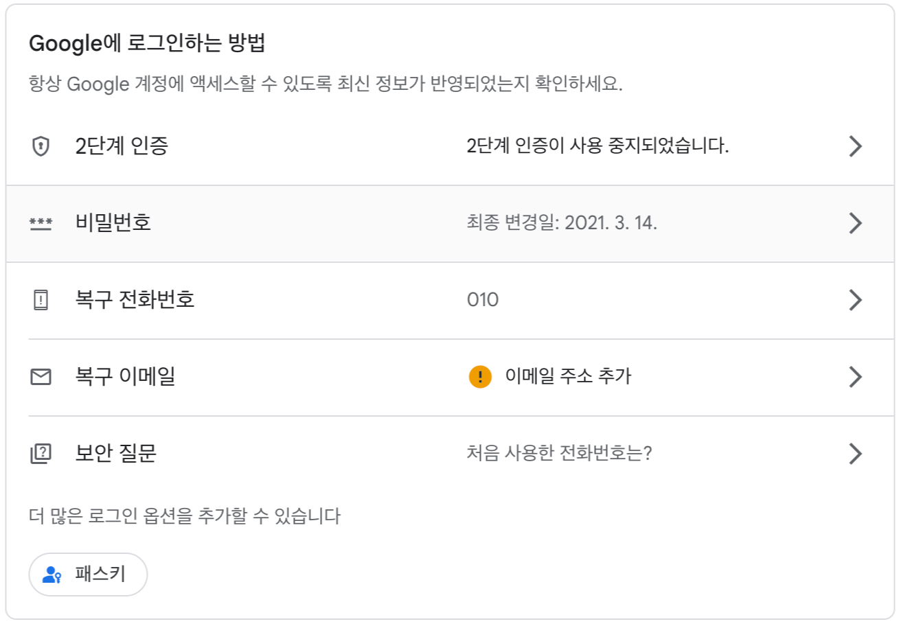 2. 보안 탭에 들어가서 2단계 인증을 눌러 인증을 해준다.