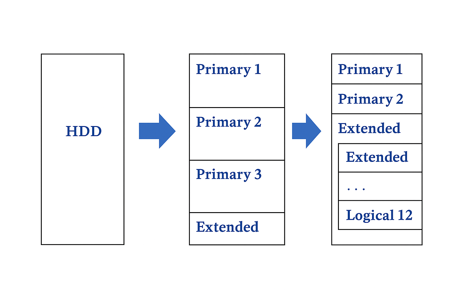 | 확장 파티션(Extended) | 주 파티션 중 하나를 확장 파티션으로 설정해, 그 안에 논리 파티션을 생성 |