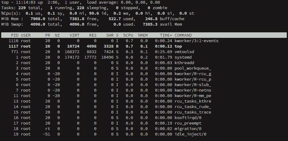 - Tasks, Mem, Swap 영역에서 프로세스 수와 메모리 상태 확인 가능