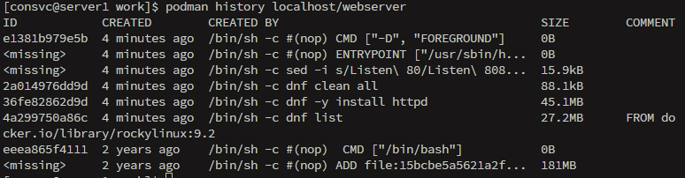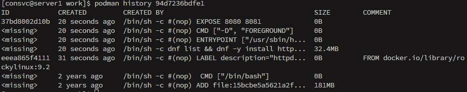 - dnf list, install, clean, sed 등 각각의 명령어를 개별 RUN으로 작성