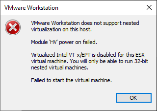 해당 에러는 ESXi와 같은 Nested Virtualization(중첩 가상화) 환경에서 발생하는 문제이다.