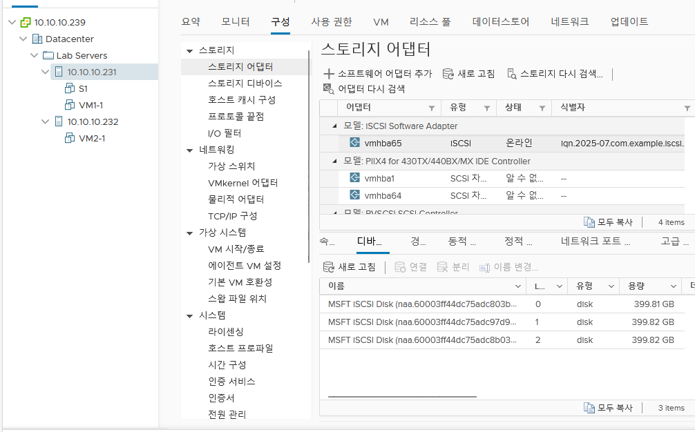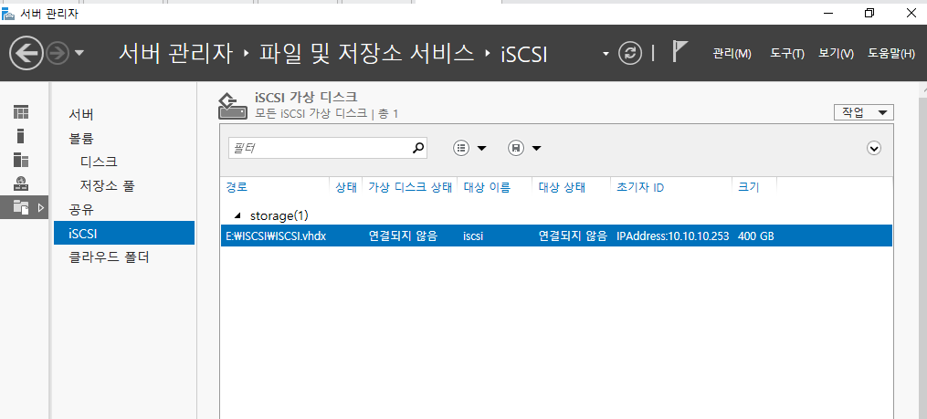 이전에 storage라는 가상머신에 만들어둔 iSCSI를 살펴보자.
