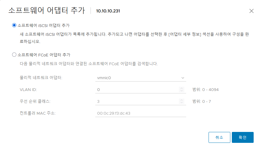 - Initiator : 스토리지 요청자 (ESXi에서 소프트웨어 어댑터로 설정)