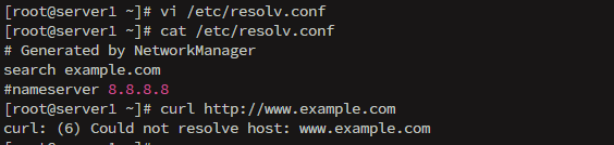 네임서버를 잠시 주석처리를 하면 외부로 나가지를 못해서 curl 명령 수행시 찾을 수 없다고 뜬다.
