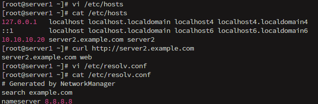 server1의 /etc/hosts 파일에 server2 도메인을 추가하자.