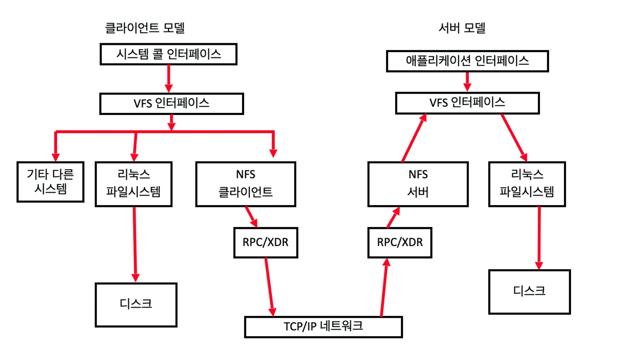 → VFS는 요청을 NFS 클라이언트 모듈로 전달 - NFS 클라이언트는 요청을 RPC/XDR 프로토콜을 통해 NFS 서버로 전달