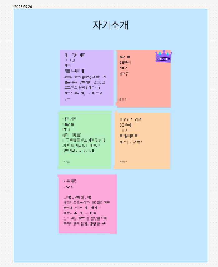 같은 기능들이 협업 생산성에 큰 도움이 되었다. 그런 경험을 바탕으로 이번에도 자기소개를 Figma로 해보자고 제안했고, 팀원들도 흔쾌히 동의해주었다. 앞으로의 브레인스토밍이나 기획에서도 유용하게 쓸 수 있을 것 같다.