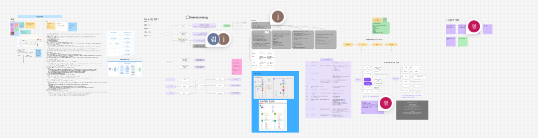 나도 개인적으로만 리서치하고 있다가 더이상 진행이 늦어지면 안되겠다는 생각에 우선 내가 생각하고 있는 내용들을 Figma에 두서없이 적어봤다. 그렇게 적어내려가다 보니 팀원들도 하나씩 살을 덧붙이고 의견을 내주어서 조금씩 진행이 되었다.