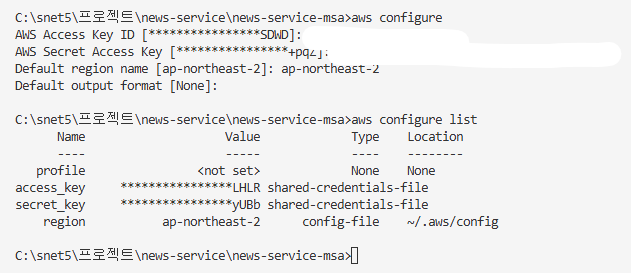 로컬 환경에서 데이터를 직접 조회하고 삽입하려면 DynamoDB 접근 권한이 필요하다. 이를 위해 내 계정의 Access Key와 Secret Key를 발급받아 aws configure에 저장했다. 실제 EKS 배포 시에는 IAM Role 기반으로 권한을 설정할 예정이다.