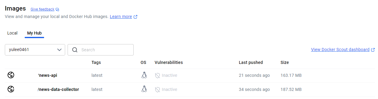 API 테스트를 마친 뒤, Docker로 이미지를 빌드해 내 DockerHub 레포지토리에 업로드했다. 그 후 로컬 환경에서 이미지를 내려받아 컨테이너로 실행하고 다시 API 테스트까지 완료했다.
