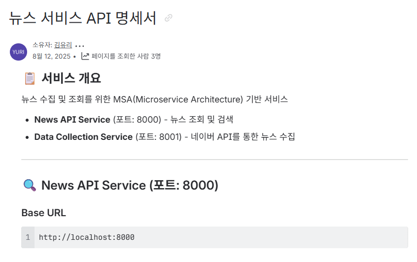 프론트엔드 개발은 다른 팀원이 맡아주셔서, 참고할 수 있도록 API 명세서를 정리했다. 아직 배포 전이라 Swagger를 쓰려면 로컬에서 컨테이너를 실행해야 하므로, 문서화된 명세서가 더 효율적이라고 판단했다.