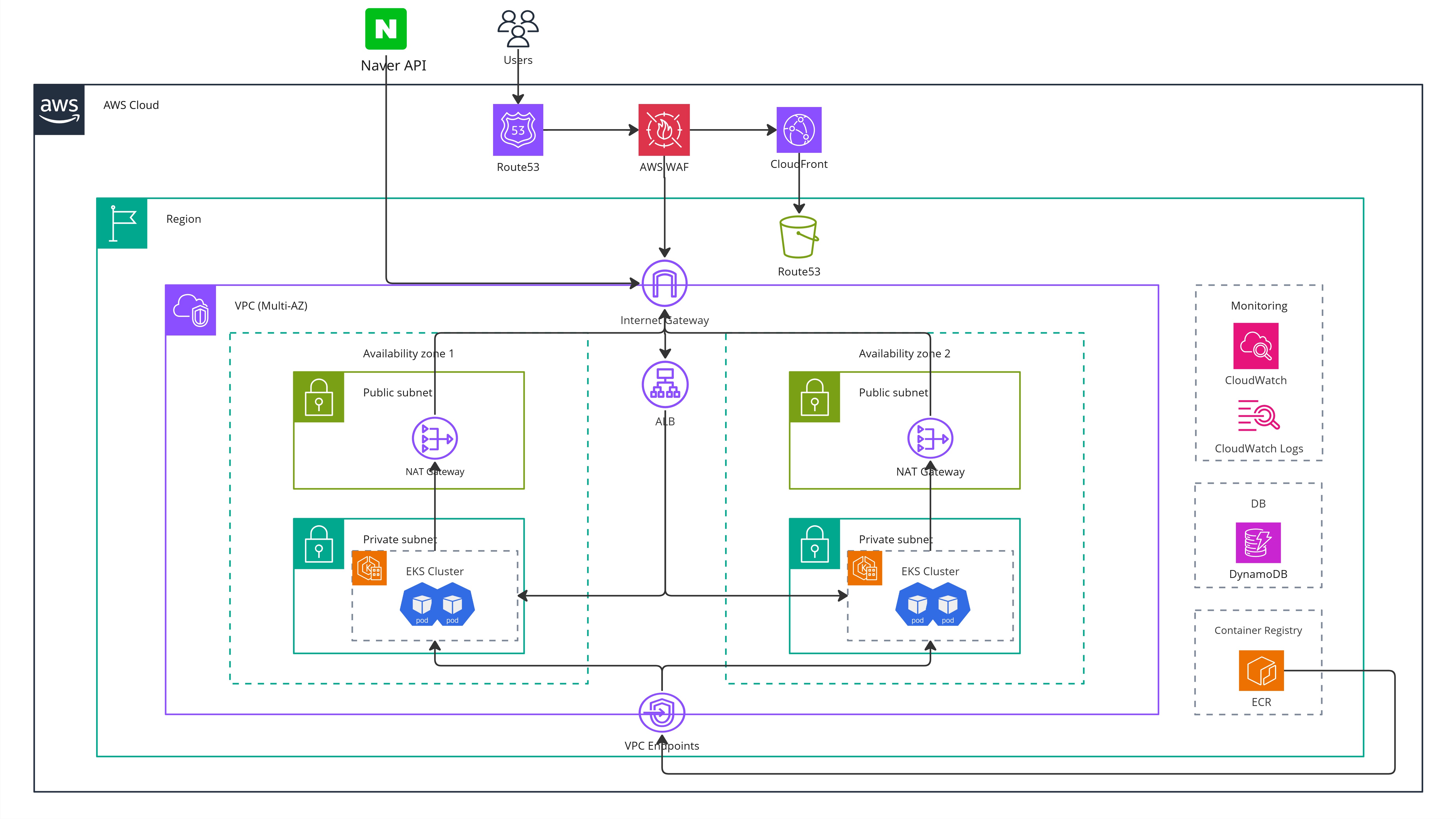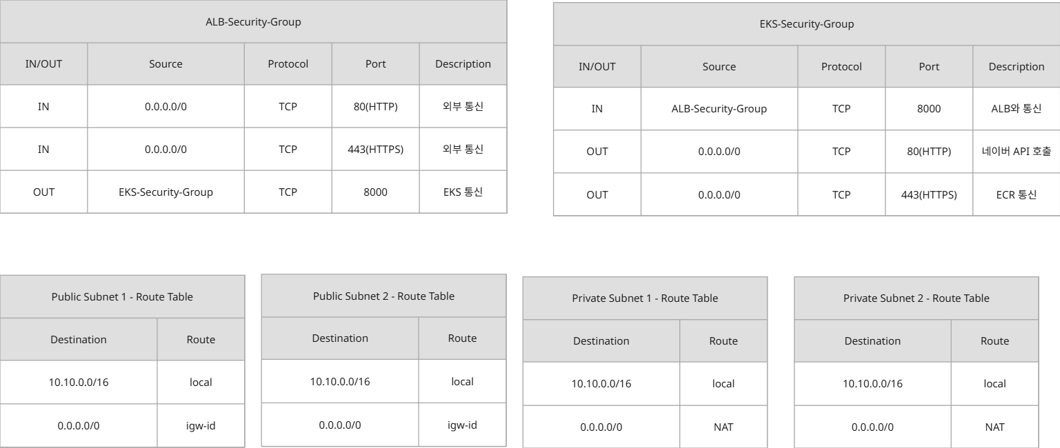 - 외부 API 호출 경로 (EKS -> 네이버 API) : EKS Cluster(데이터 수집 Pod) -> NAT Gateway -> Internet Gateway -> 네이버 API