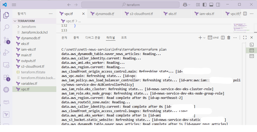 코드를 작성한 뒤 terraform plan으로 변경 사항을 시뮬레이션하고, 이어서 긴장되는 마음으로 terraform apply를 실행했다.