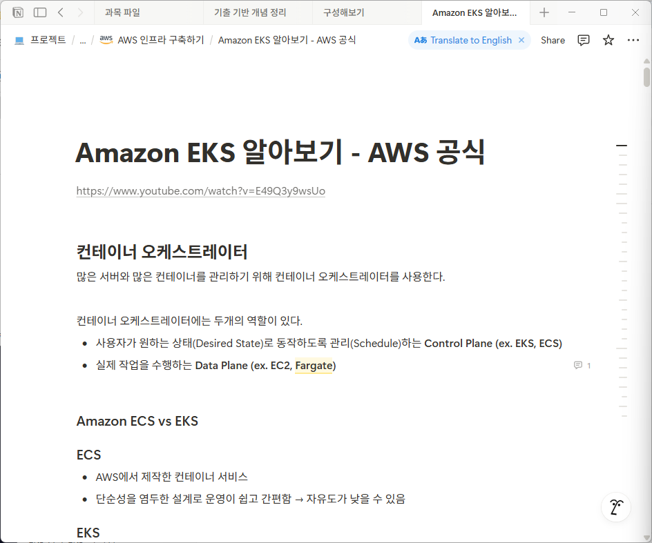 단순히 영상을 시청하는 것에 그치지 않고, 헷갈릴 수 있는 개념들을 언제든 다시 볼 수 있도록 Notion에 정리했다. 이 정리된 내용은 앞으로 실제로 EKS Cluster를 구성할 때 참고 자료로 활용할 예정이다.