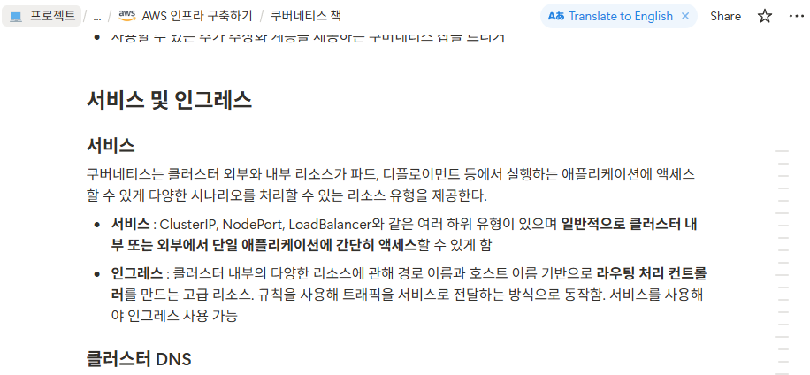 혹시 설정 과정에서 내가 놓친 부분이 있을까 싶어, 교육 과정 중 받았던 책을 다시 펼쳐보았다. 앞부분의 이론 위주로 읽으며 헷갈리는 부분은 따로 Notion에 정리했고, EKS Cluster 구성에서 수정할 만한 부분이 있는지도 고민해보았다. 책을 보기 전에 Ingress 부분이 조금 헷갈렸는데 개념을 정리할 수 있는 좋은 기회였다.