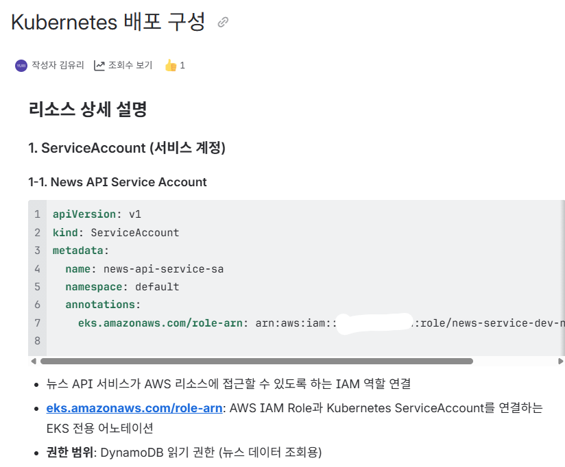팀원들과 공유하기 위해 EKS Cluster 내부에 생성한 리소스에 대한 문서를 작성했다.