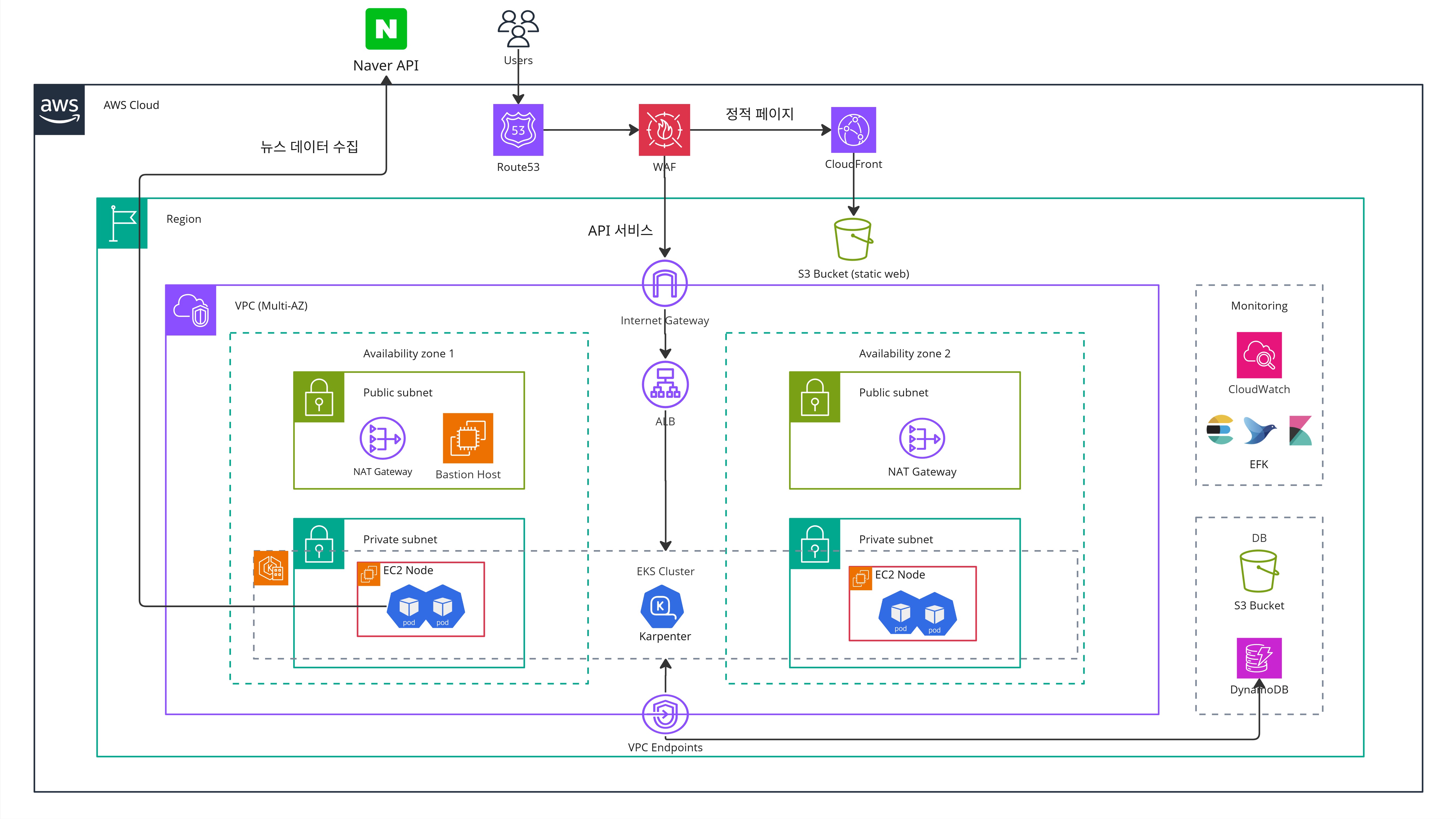 사실 크게 바뀔 부분은 없었지만, EKS 내부 구성을 조금 더 반영해야 해서 수정 작업이 필요했다. 프로젝트 일정이 바쁘다 보니 멘토링 전날 밤늦게까지 급히 작업을 했고, 그 덕분에 자격증 공부는 거의 못 했다🥲 그래도 다이어그램이 정리되니 마음은 한결 놓였다.