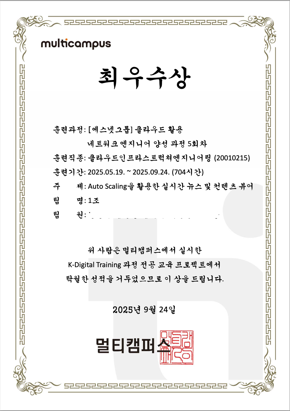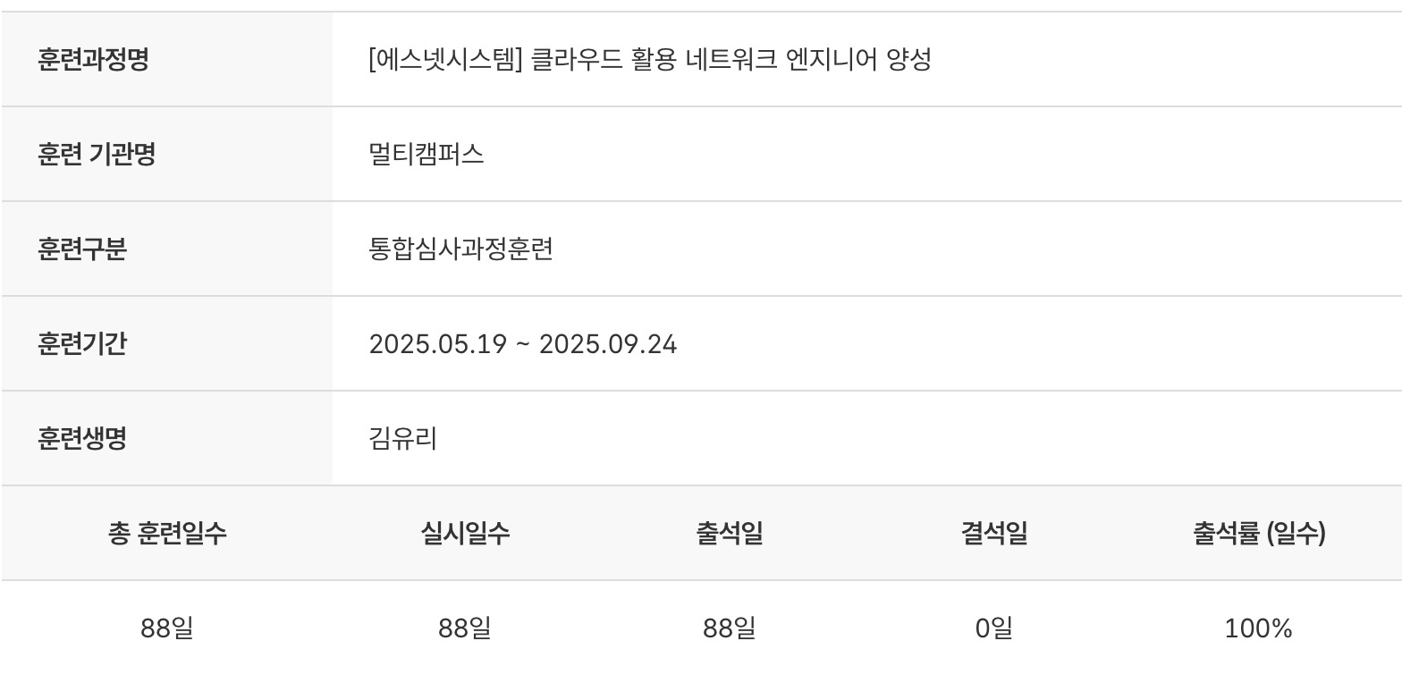 전공자에게는 꽤 괜찮은 과정일 수 있다. 특히 네트워크 엔지니어나 클라우드 분야에 관심 있는 사람이라면 실질적으로 도움이 된다. 다만 모두가 적극적인 팀플을 기대하지는 않았으면 한다. 나처럼 "써보고 싶은 기술이 있다"거나 "AWS 같은 비용이 드는 리소스를 직접 다뤄보고 싶다"는 목표가 있거나, 팀플 경험이 많아 Jira나 GitHub Projects, Notion 등을 활용해 작업을 공유하고 비전공자 팀원을 서포트할 수 있는 리더십이 있다면 충분히 가치 있는 과정이 될 것이다.