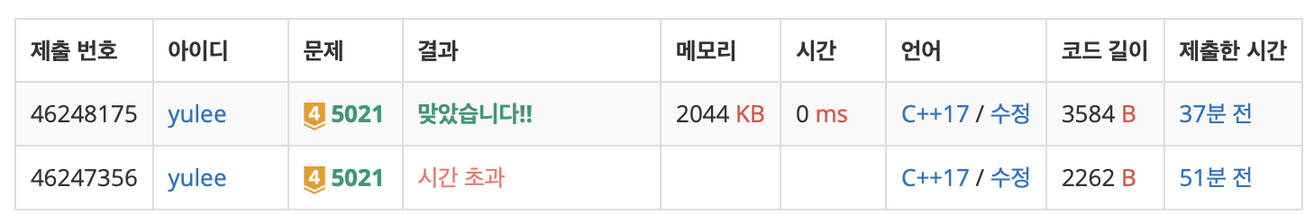 ์๊ฐ์ด๊ณผ๊ฐ ๋ฌ๋ค. ์์งํ ์ฒ์๋ถํฐ ์ฌ๊ทํจ์๋ฅผ ์ฐ๋ฉด ๋ ๊ฒ ๊ฐ๋ค๊ณ ์๊ฐํ๋๋ฐ n๊ณผ m์ ์ต๋๊ฐ 50์ด๊ธธ๋ ๊ตณ์ด ์ฐ์ง ์์๋ ๋ ์ค ์์๋๋ฐ...