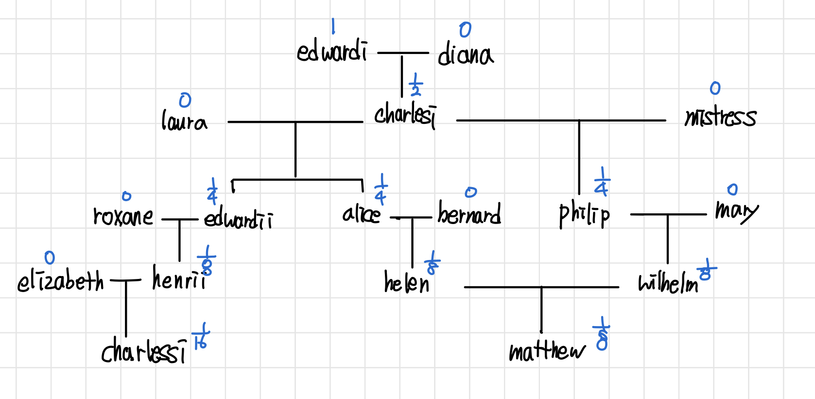 ์์ ์ ๋ ฅ1์ ๋ฐํ์ผ๋ก ์ง ๊ฐ๊ณ๋์ด๋ค. helen๊ณผ wilhelm์ ์์ matthew์ ๊ด๊ณ๊ฐ ์ ๋ ฅ์์ ๋จผ์ ๋์ค์ง๋ง ๊ฒฐ๊ณผ์ ์ผ๋ก helen ๋ํ ์์กฑ์ด ๋๋ฏ๋ก ์ ๋ ฅ ์ค๊ฐ์ ๊ณ์ฐ์ ๋ถ๊ฐ๋ฅํด ๋ณด์๋ค.