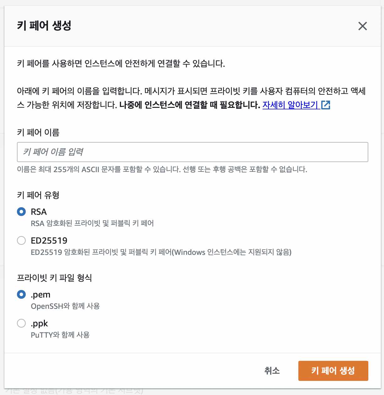 기존에 쓰던 키 페어를 쓸 경우엔 선택해주고, 새로 만들어 줄 경우엔 새 키 페어 생성을 눌러준다.