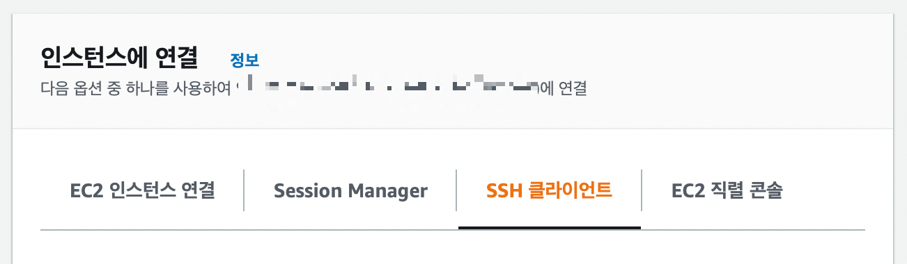 연결을 눌러주면 인스턴스에 연결이라는 페이지가 뜨는데 여기서 SSH 클라이언트를 눌러 준다.