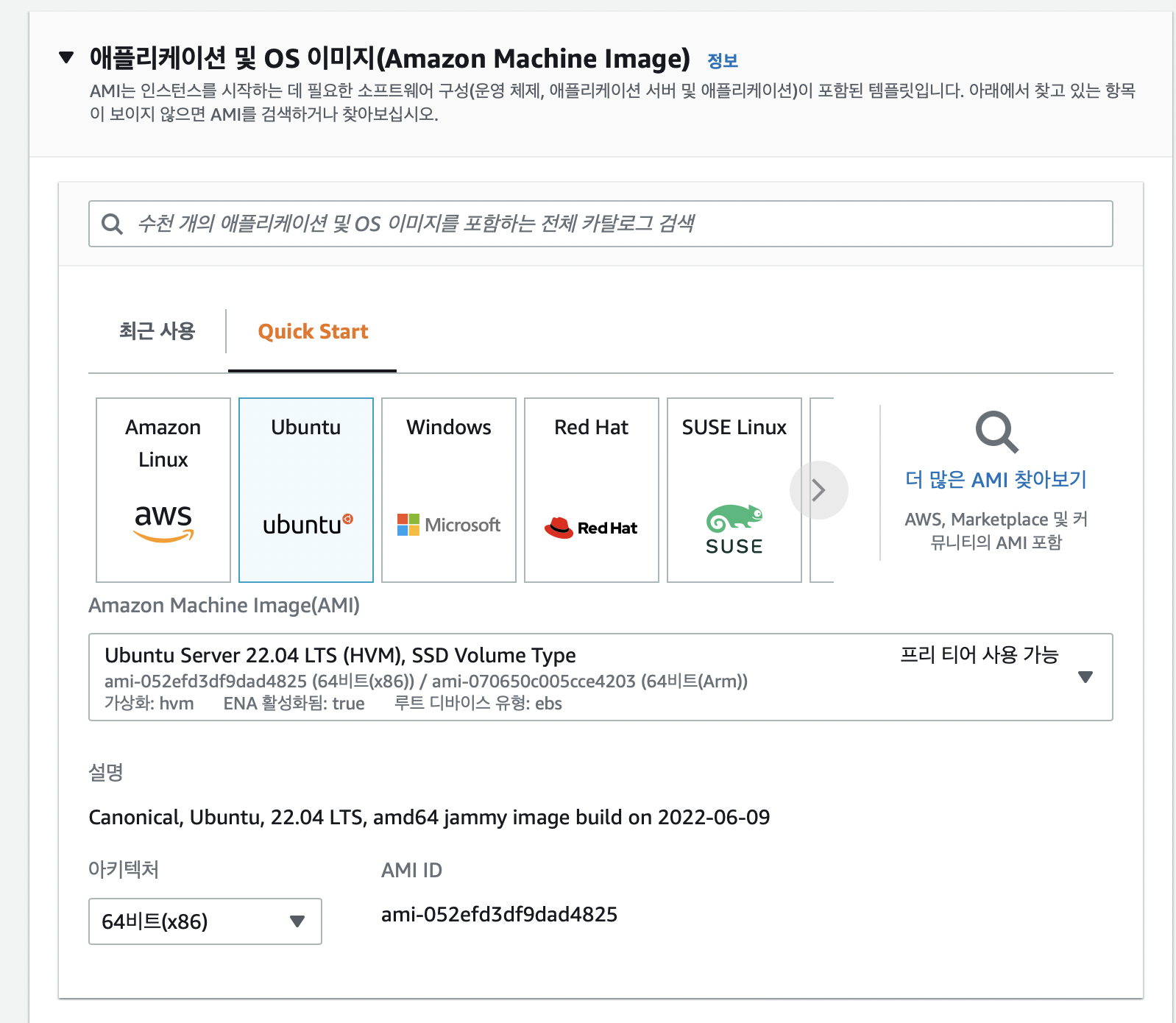 Quick Start에서 Ubuntu로 선택하고 AMI는 무료로 사용가능한 Ubuntu Server 22.07 LTS (HVM), SSD Volume Type으로 선택해준다. (Ubuntu 선택 시 자동으로 선택됨)