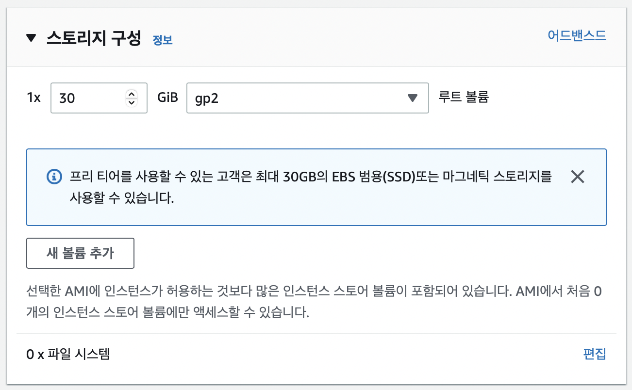 스토리지는 적은 것보단 많은게 좋으니 프리 티어에서 제공해주는 최대 용량인 30GB으로 설정해준다.