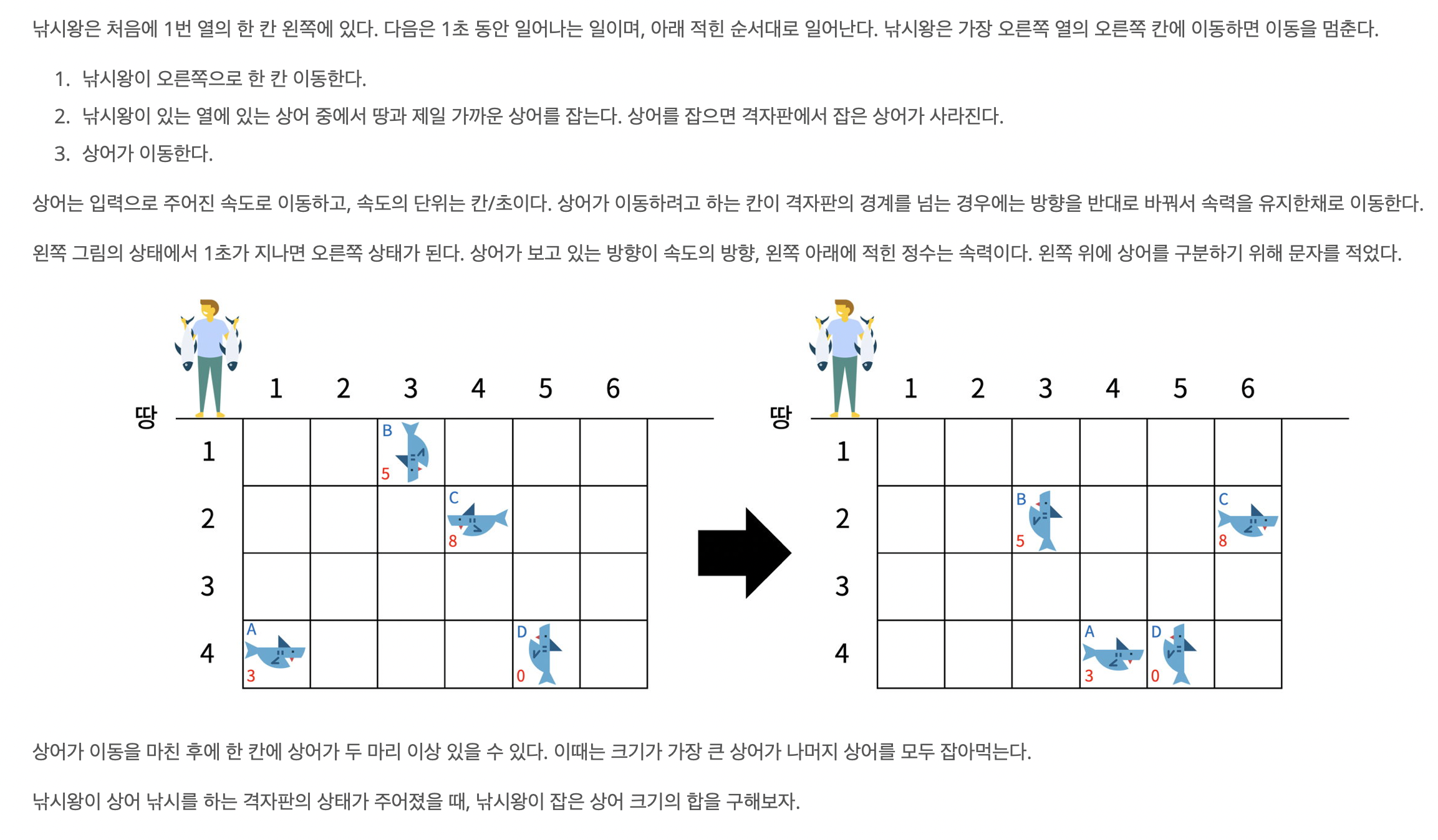 ๋์์๋ 1์ด๋ง๋ค ์ค๋ฅธ์ชฝ์ผ๋ก ์ด๋ํด ๋์์์ด ์์นํ ์ด์ ์๋ ์์ด ์ค ๊ฐ์ฅ ์์ ์๋ ์์ด๋ง ์ก์ ์ฌ๋ฆฌ๊ณ ์ก์ ์์ด์ ํฌ๊ธฐ๋ฅผ ๋ชจ๋ ํฉํ ๊ฐ์ ์ถ๋ ฅํ๋ ๋ฌธ์ ์ด๋ค.