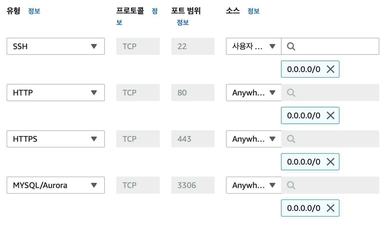아래와 같이 SSH, HTTP, HTTPS, MYSQL/Aurora를 설정해주고 저장한다.