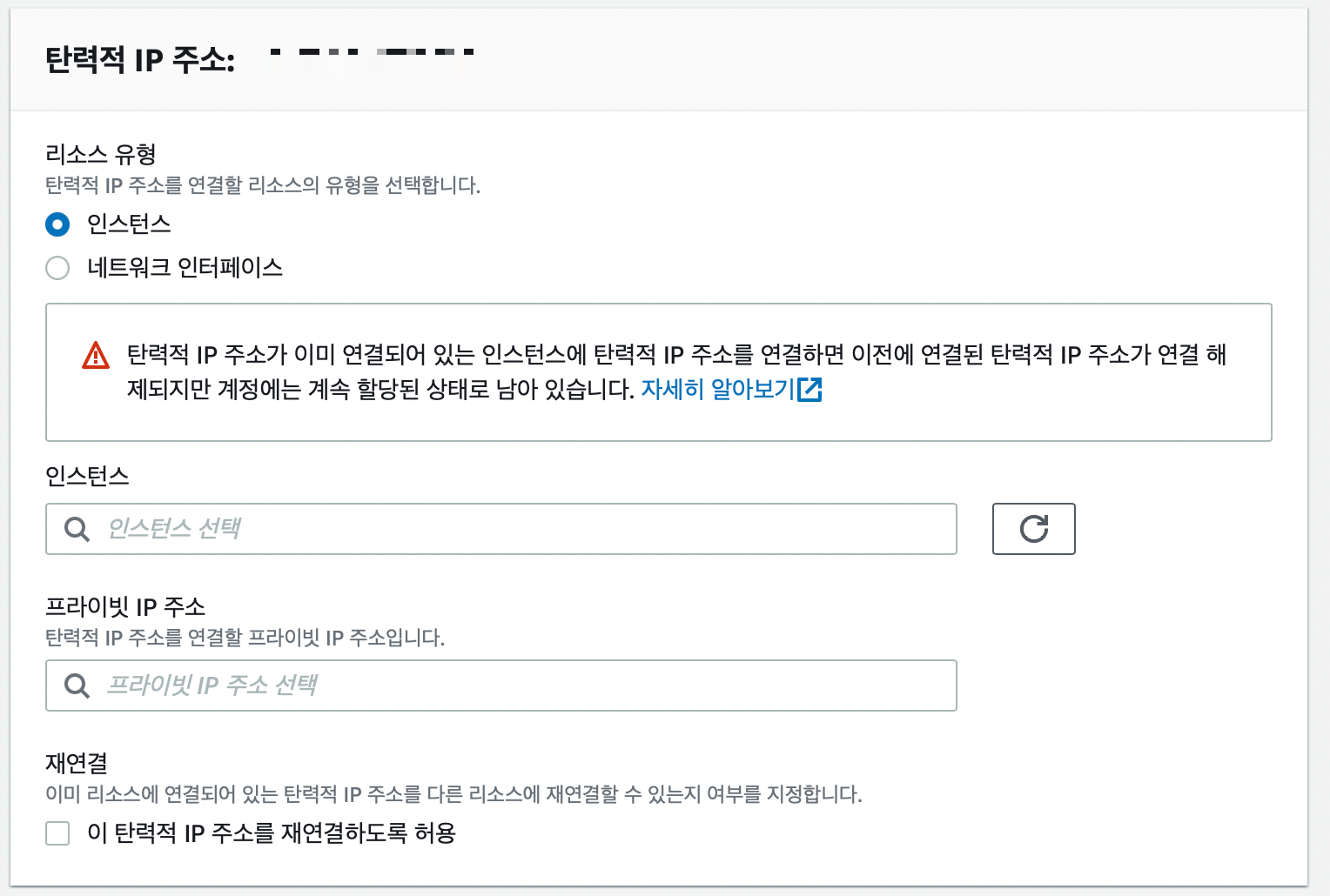 새로 만든 탄력적 IP 주소를 눌렀을 때 뜨는 탄력적 IP 주소 연결을 누르고 아래 인스턴스 부분에 기존에 만들어 뒀던 인스턴스를 선택해준다.