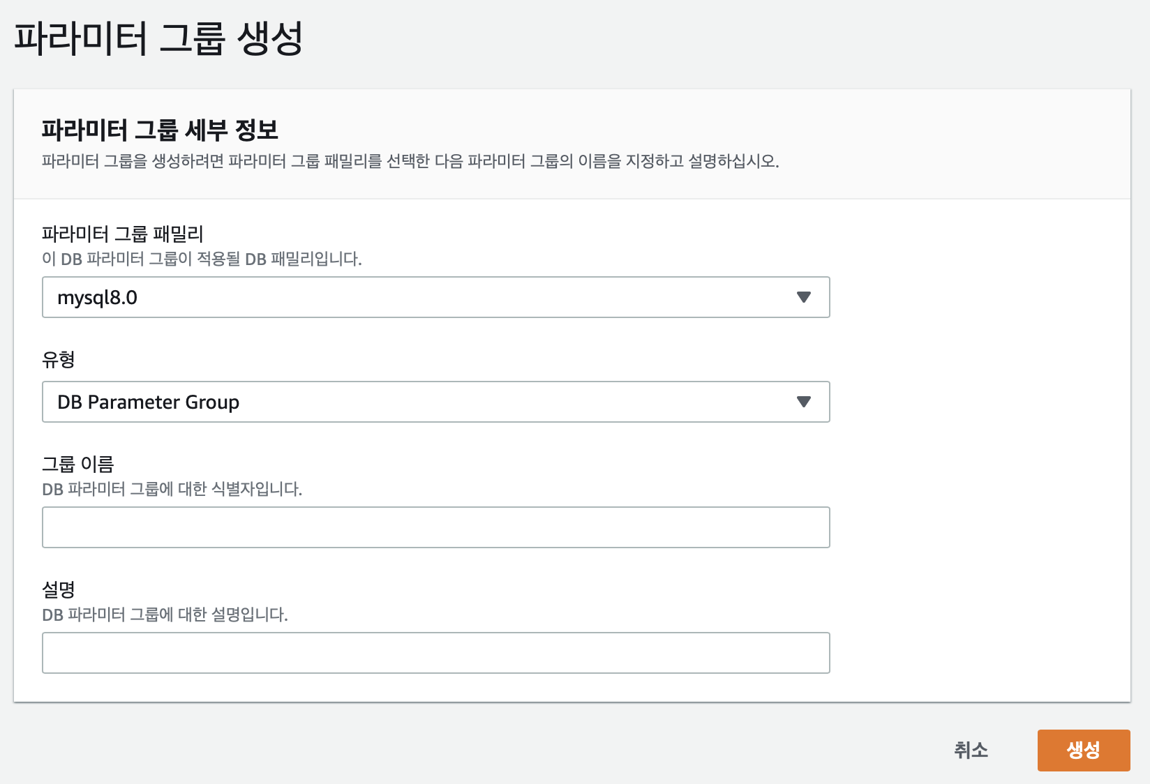 RDS 페이지에서 왼쪽 메뉴에 있는 파라미터 그룹 항목을 선택 후 파라미터를 새로 하나 만들어 준다.