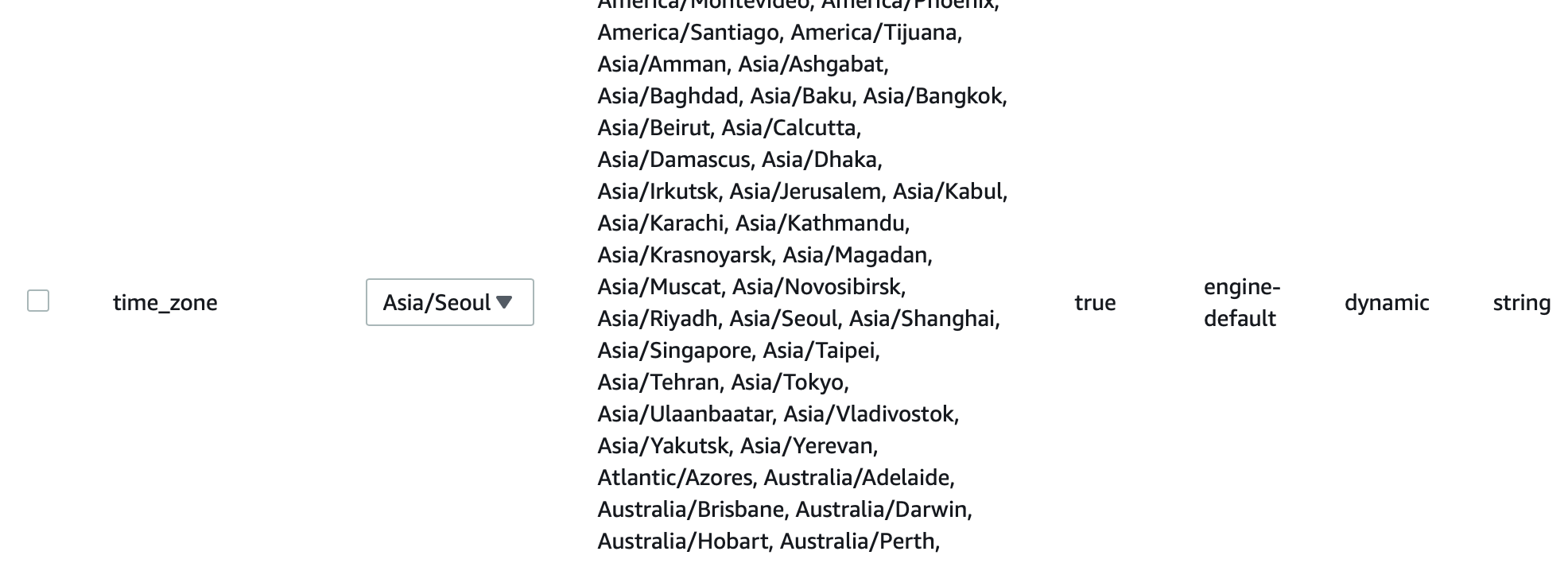 만들어준 파라미터 편집을 눌러 검색창에 time_zone을 입력한다.