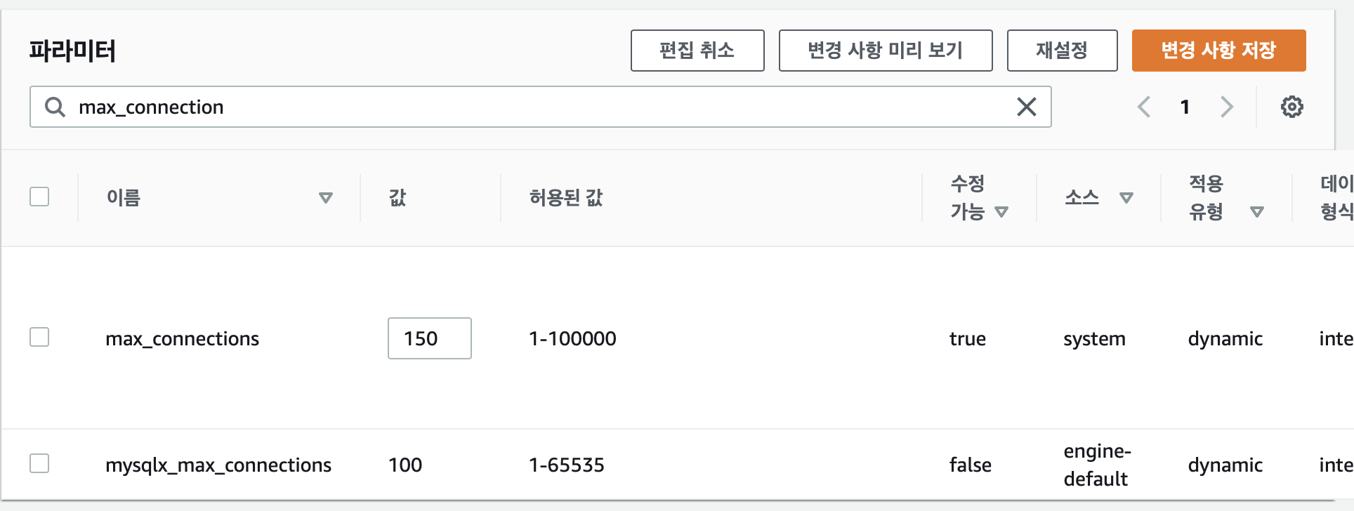 검색창에 max_connection을 검색해 해당 옵션을 150으로 변경 후 마지막으로 변경 사항 저장을 눌러준다.