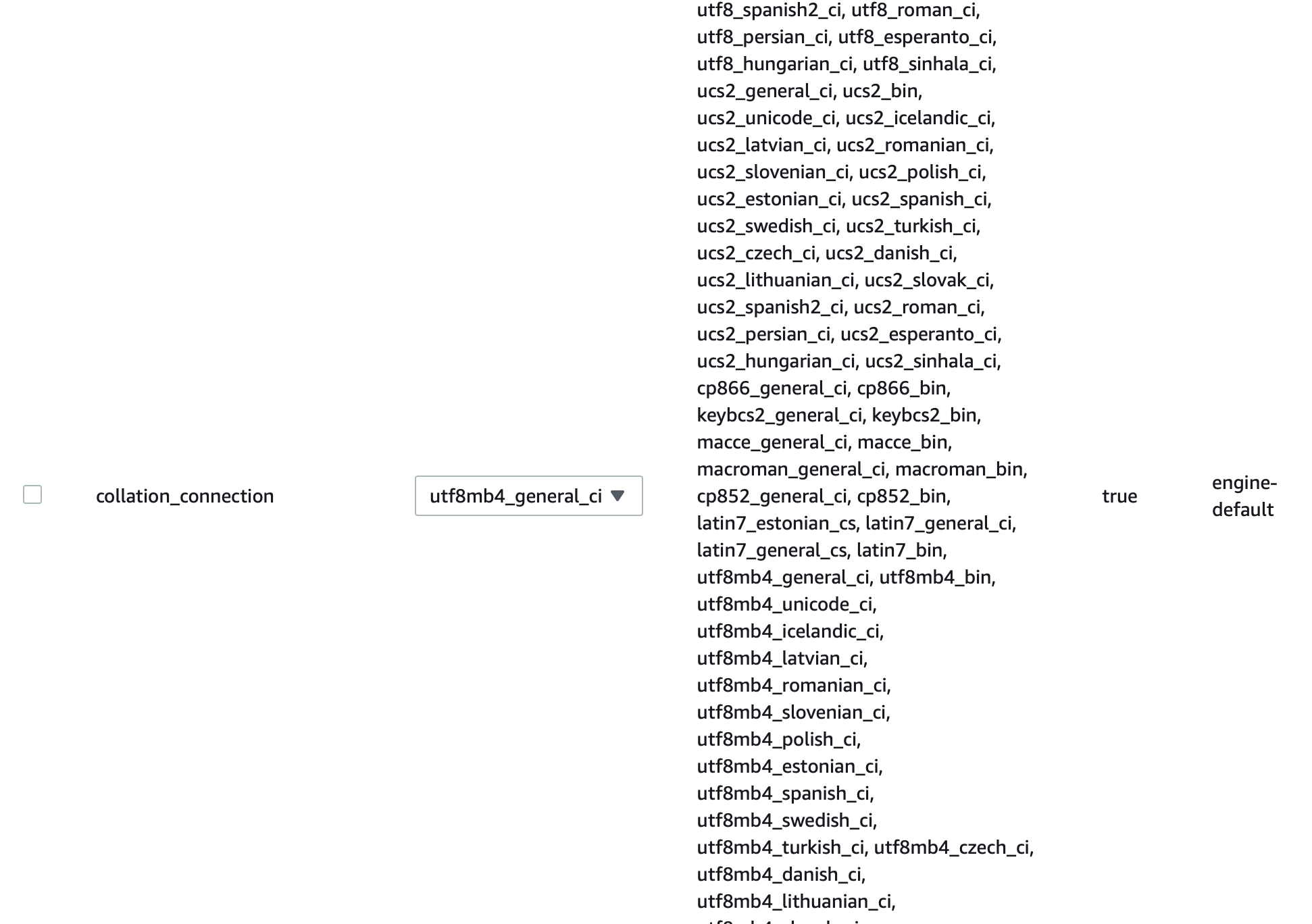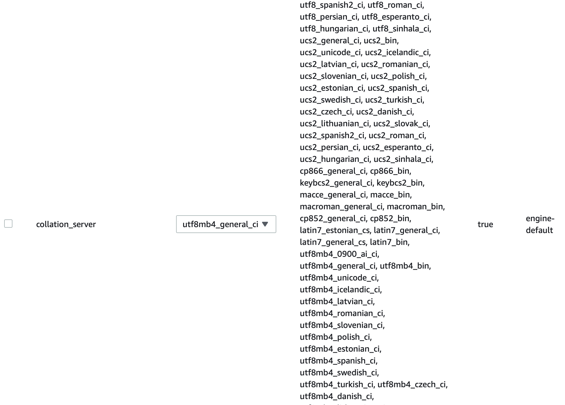 검색창에 collation을 검색해 나오는 collation_connection과 collation_server를 utf8mb4_general_ci로 변경