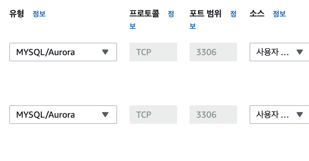 MYSQL/Aurora 3306 포트를 선택하고 EC2의 IP주소와 로컬의 IP주소를 입력해주면 완료