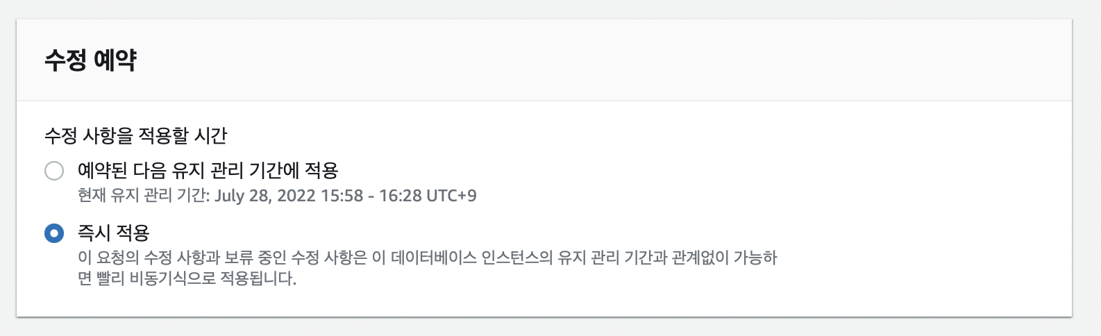 추가 구성의 DB 파라미터 그룹을 새로 생성한 파라미터 그룹으로 바꿔주고, 수정 예약에서 즉시 적용을 선택한 후 수정을 눌러준다.