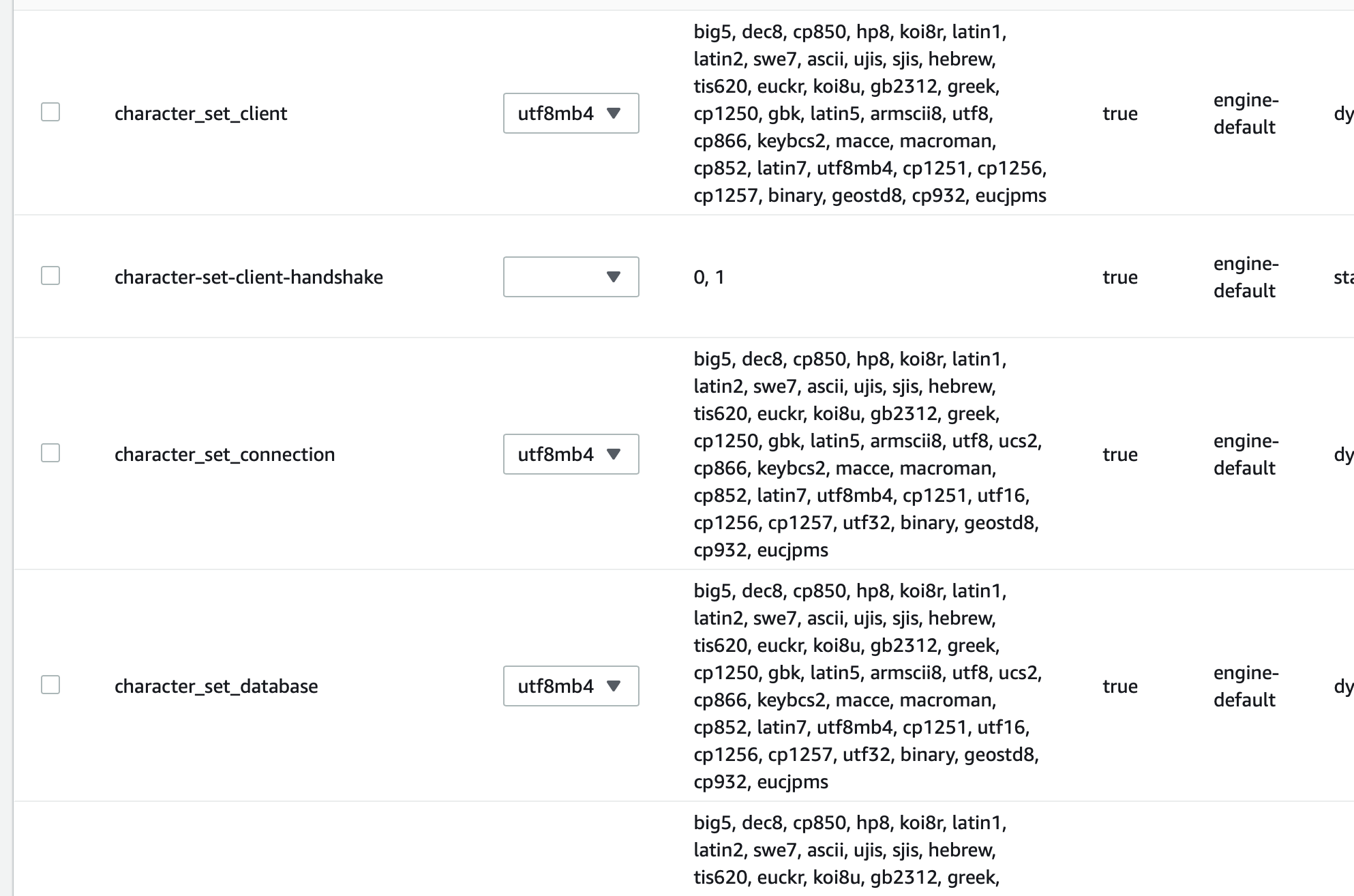 검색창에 char을 검색해 character_set_client, charcter_set_connection, charcter_set_database를